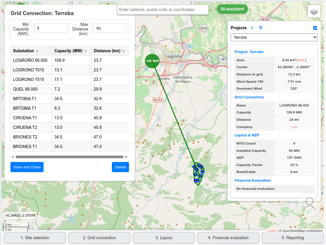 Grid Connection Identification: Smart matching with nearest substations and high-voltage lines using real grid maps and available capacity data. Includes calculation of distance-to-grid and potential connection complexity.